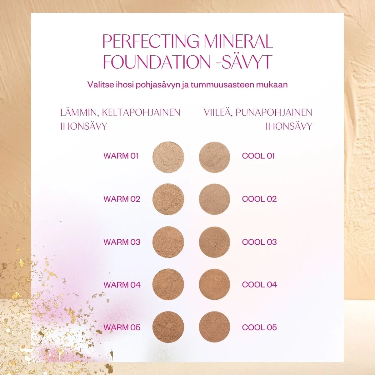 Perfecting Mineral Foundation on hienojakoinen mineraalimeikkipuuteri, joka tasoittaa ihon sävyä ja jättää iholle kauniin, kuulaan lopputuloksen. Kevyt mutta kerrostettava koostumus mahdollistaa peittävyyden säätelyn luonnollisesta kevyestä lopputuloksesta aina täysin peittävään meikkiin.