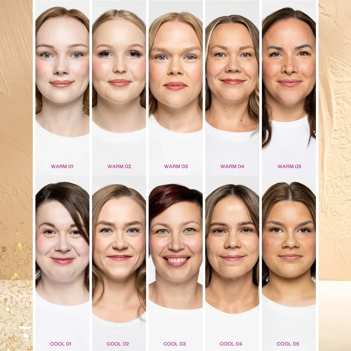 Avokadoöljyllä kapseloidut mineraalipigmentit levittyvät pehmeästi myös kuivalle ja pintakuivalle iholle, eivätkä korosta kuivia kohtia. Lopputulos on tasainen, hengittävä ja pitkäkestoinen. Sopii kaikille ihotyypeille, erityisesti normaalille, kuivalle ja herkälle iholle.